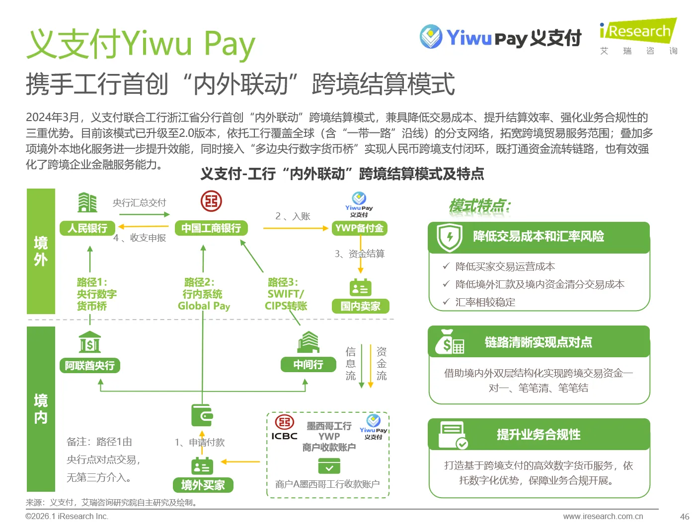 义支付联合工行浙江省分行首创“内外联动” 跨境结算模式(具备成本和效率优势),后随工行“跨境e 电通” 海外版上线升级至 2.0 版,依托工行全球(含 “一带一路”)分支网络扩覆盖,叠加多项境外本地化服务提效,还接入“多边央行数字货币桥”实现人民币跨境支付闭环,强化跨境电商金融服务能力。