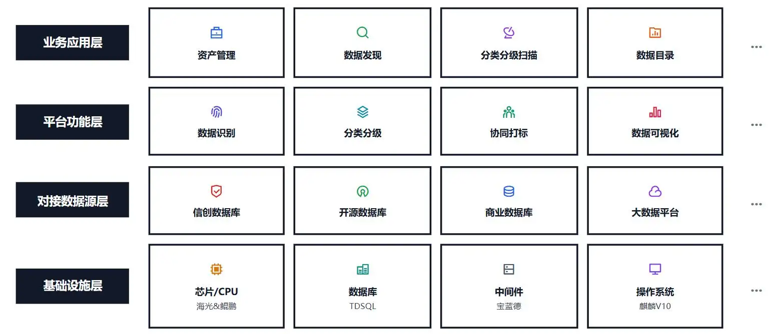 平台功能层:数据分类分级相关的核心能力建设,像数据识别、分类分级处理、协同打标以及数据可视化等关键功能都在此层实现,是完成分类分级工作的核心环节。