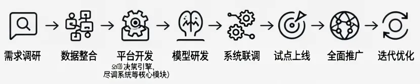 3. 设计流程:需求调研→数据整合→平台开发(决策引擎、尽调系统等核心模块)→模型研发→系统联调→试点上线→全面推广→迭代优化。