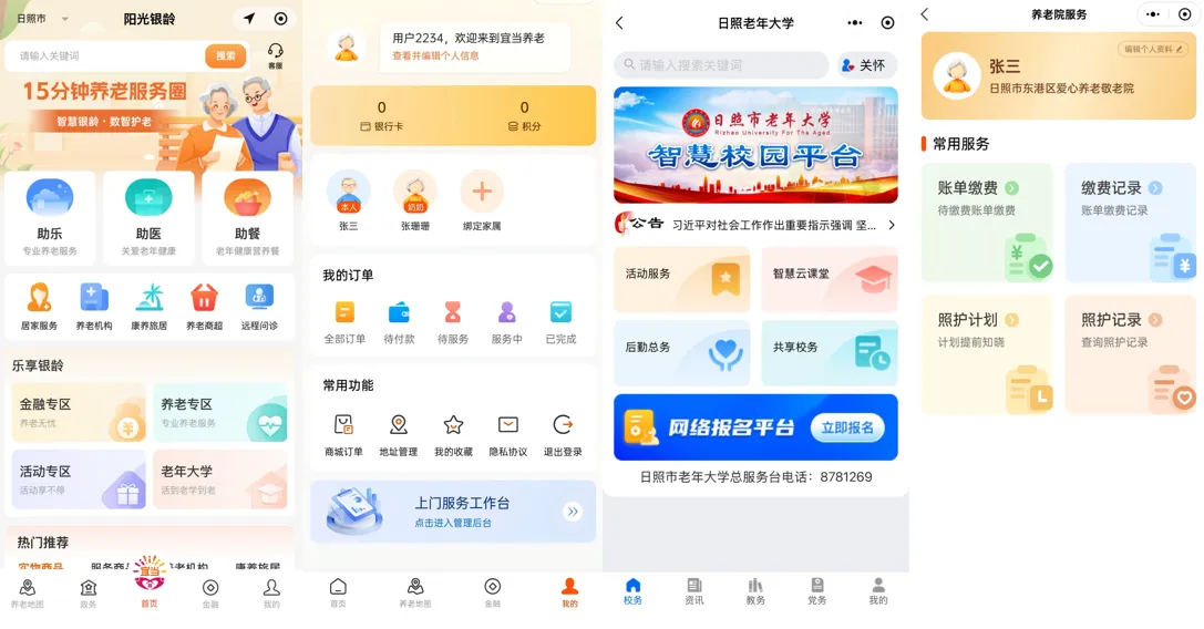 平台依托“用户端、机构端、监管端、运营端”四端协同架构,深度整合医疗、家政、教育、文旅、金融等多元养老服务资源,围绕老年人居家照料、健康管理、文化娱乐等高频生活场景,打造“线上精准对接+线下优质服务”的智能化服务体系,并为养老机构、老年大学、政府主管部门提供数字化管理平台,以数字化技术打通数据壁垒、衔接服务链条、优化管理效率,构建“政府引导、企业联动、银行赋能、居民应用”协同机制,全面赋能养老服务产业数字化转型,助力实现从“养老”到“享老”的幸福升级。