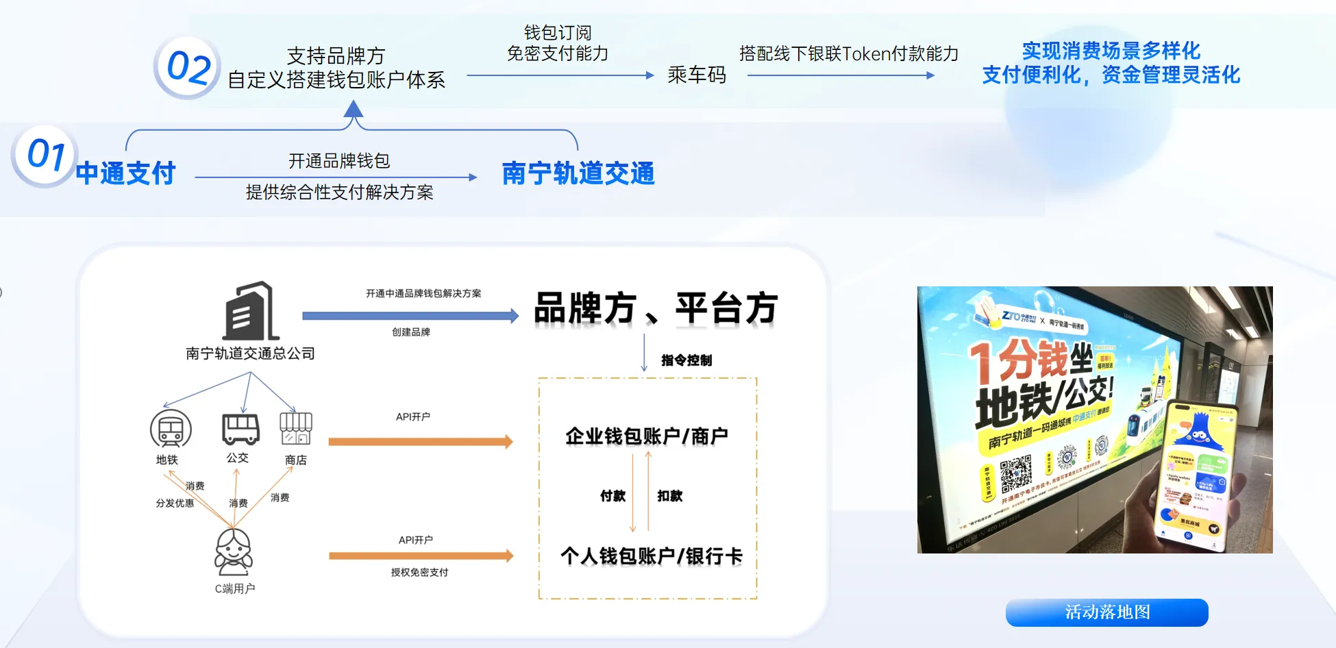 - 项目效果:提升市民出行支付便捷性,实现公共交通支付的数字化升级;支付成功率显著提升,减少因流程复杂导致的用户流失;沉淀市民出行数据,为后续优化公共交通服务提供支撑;助力南宁公共交通场景的服务效率提升,推动区域数字经济发展,成为品牌钱包在公共交通领域的标杆案例。