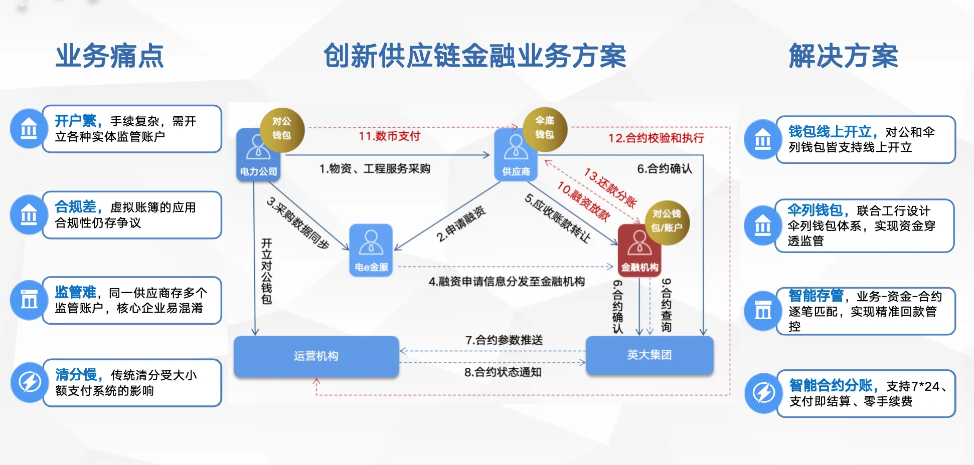 场景痛点:电网产业链末端的供应商多为中小企业,存在融资难、融资贵、融资慢等问题;核心企业信用难以穿透传递至末端;资金监管路径长,账务处理复杂,易出现资金挪用风险。