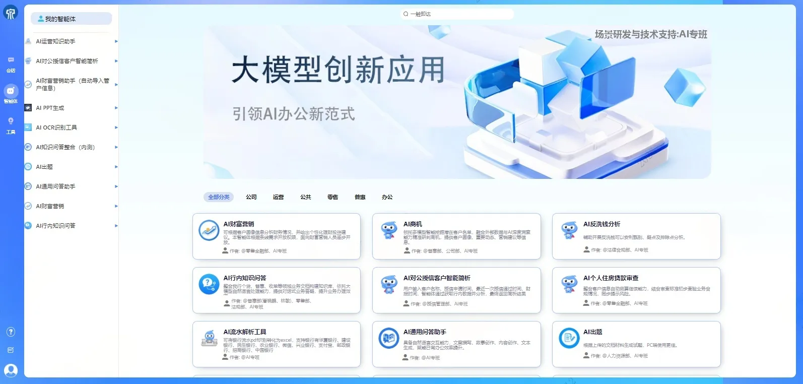 功能描述:整合行内业务知识库、合规政策库,支持客户经理以自然语言查询业务规则、监管政策、系统操作流程等问题,秒级返回精准答案。