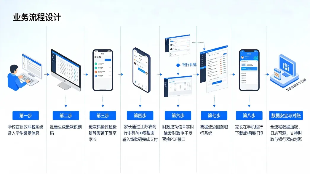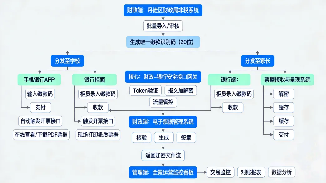 本方案是由镇江农商银行与丹徒区财政局联合打造的“财政+银行”跨界服务创新项目,旨在破解教育缴费场景中“缴费易、开票难”的民生痛点。方案以财政非税系统为核心支撑,以银行渠道为服务触达点,构建了一套安全、高效、全流程数字化的电子发票自动换开体系,实现“一键缴费、即时开票、秒级获取”,推动非税收入管理向自动化、无纸化、智能化转型。目前已在丹徒区全面推广,服务数万家庭,成为江苏省农商行系统内首个实现财政电子发票全流程线上化的标杆案例。
