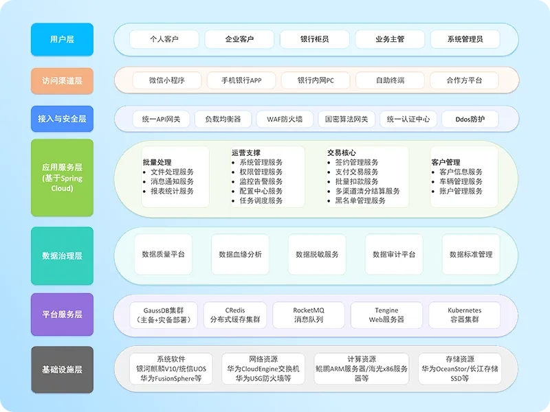 本方案在国家金融科技自主可控战略的指导下,我们与某国有大行共同开展了ETC支付系统的重构工作。面对传统架构升级和海量历史数据迁移两大挑战,以“全栈信创筑基、金融云化赋能”为主线,通过系统化改造,在该行金融云环境中实现了分行级ETC支付系统的信创转型与云原生升级。项目完成了超10年10亿级历史数据的迁移,并推出了线上与线下皆可办理的双模式服务体系。本方案为金融业务系统的信创改造与云化迁移提供了初步探索与参考。