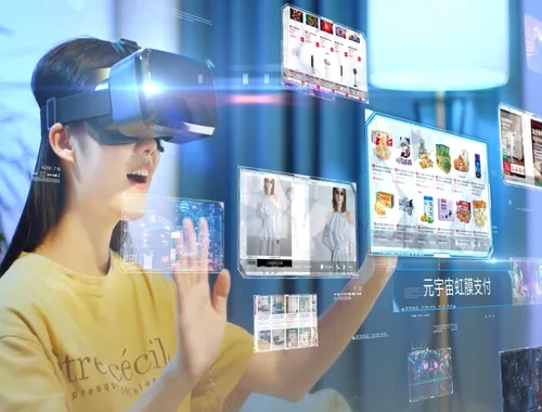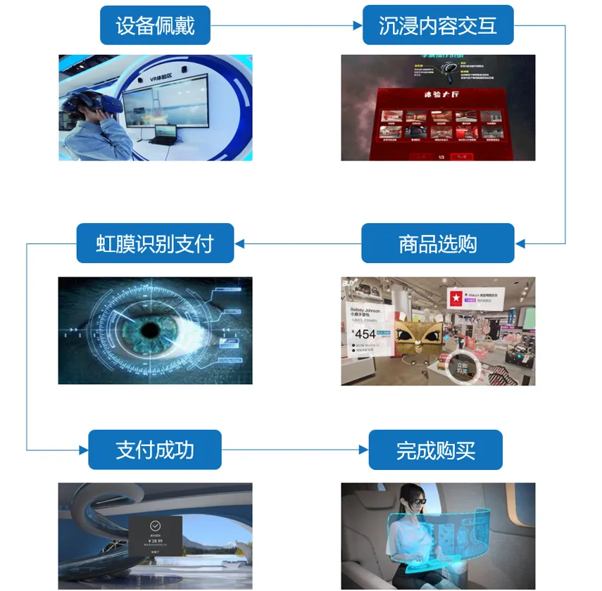 用户可选择设备配套手柄或手势识别完成全流程操作,通过手柄点选或手势抓取查看商品详情,拖拽交互将商品加入购物车;在购物车页面,支持点选查看、拖拽删除商品;确认下单后,通过缩放交互触发支付界面,无需切换设备或输入密码,直接启动虹膜支付完成结算,全程不中断元宇宙沉浸式体验。