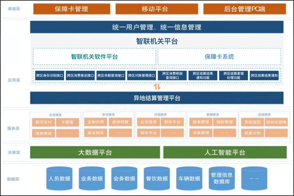 本项目建设的“智联机关”移动服务平台旨在为西安市区两级党政机关工作人员提供一个内部服务保障APP,该APP具有10个子平台,70个线上服务窗口,政府工作人员可以通过该APP实现身份认证、信息获取、业务办理和社会化服务,并可跨行政园区访问获取其它园区的各类服务。“智联机关”平台具有线上支付功能,其核心支付渠道是由“后勤服务保障卡”(卡样如下图5所示)提供的金融支付,“后勤服务保障卡”同时也是“智联机关”的实名认证基础。具体实现功能如下: