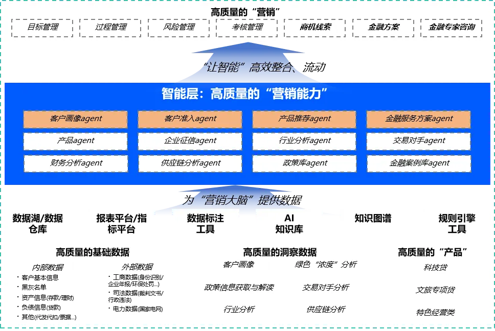 输入端以高质量的基础数据(内外部整合)和高维度的洞察数据(政策、行业、客户、产品分析)为养料。处理端通过多智能体系统,进行客户需求理解、行内产品政策匹配、金融解决方案生成等复杂加工。输出端生成高质量的营销能力(目标管理、过程管理、商机线索、风险管理等)和最终交付给客户经理的金融服务方案。确保数据、知识、策略的有机融合与持续流转,形成从信息获取到价值创造的商业闭环,从根源上解决了工具重复建设、智能层缺失的问题。