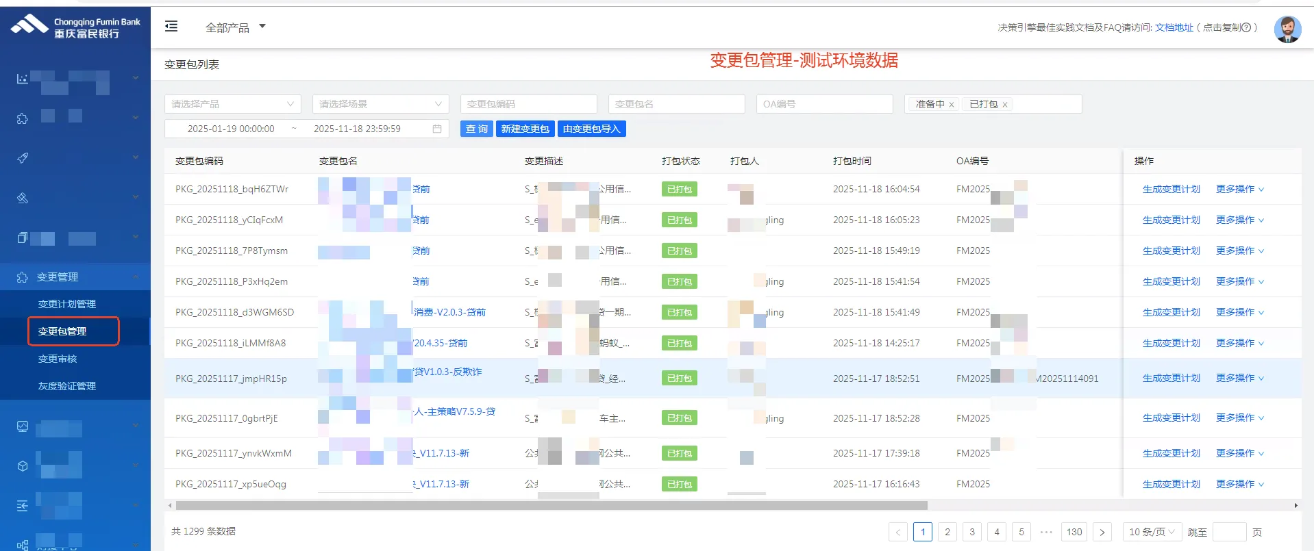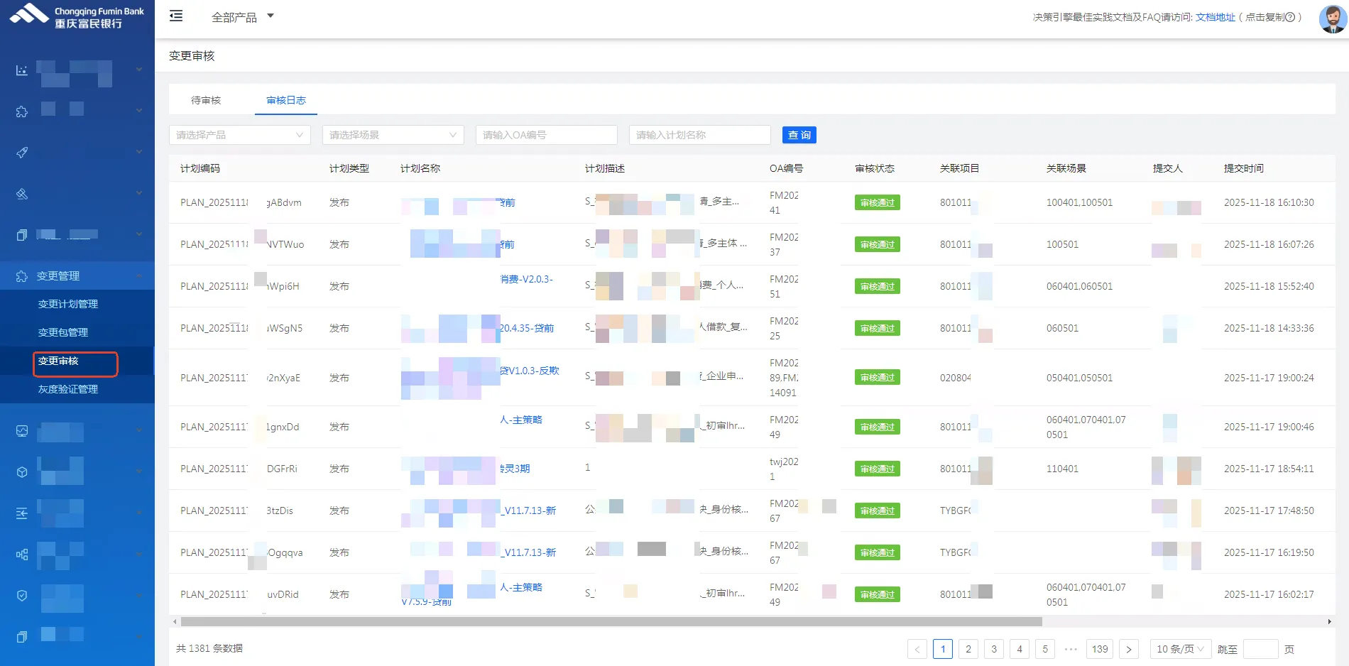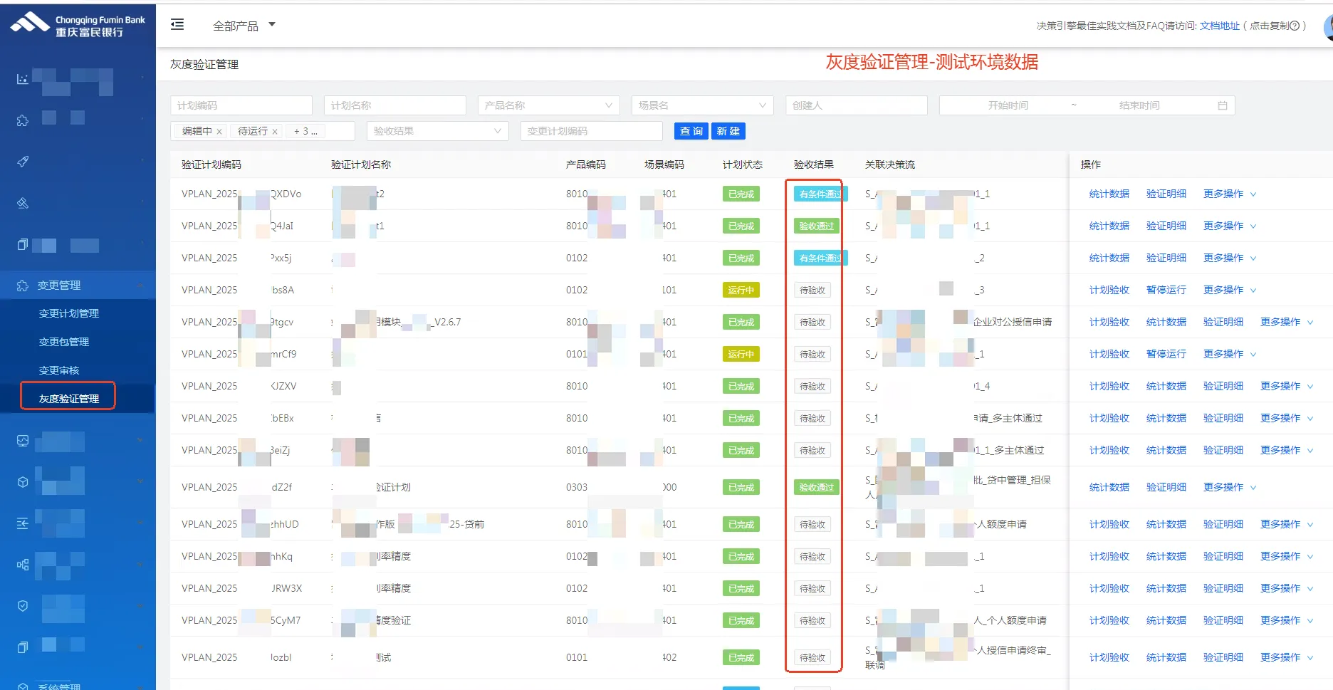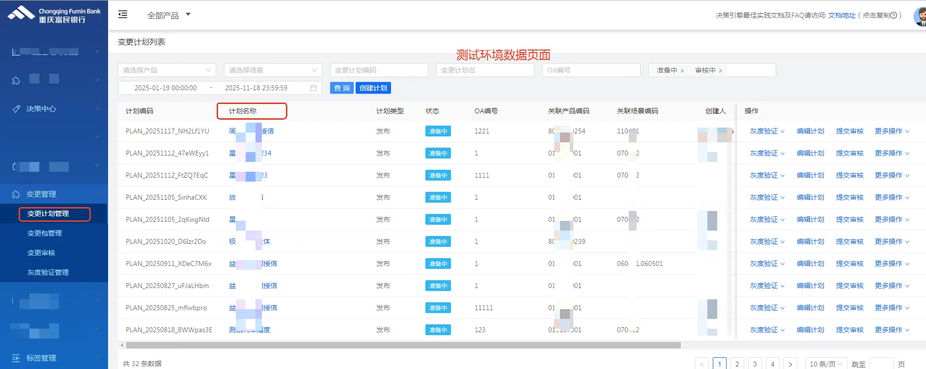 2、变更计划:用户可根据项目情况创建计划,可选择笔数、时间段、流量等数据进行实时比线上版本与即将上线版本之间的结果差距,有效展示出项目的执行情况、规则明细、审批结果等。所有内容均已固化,包括审核通过或者审核拒绝后均不能对变更计划进行编辑,但可以对变更计划作废。