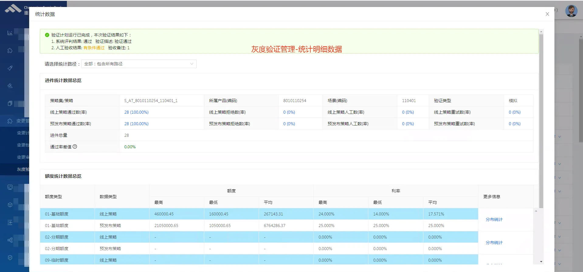 •验证结果直接作为上线审批依据,辅助评估策略有效性、稳定性及业务影响(如是否批准、授信额度调整等),实现“用数据说话”的科学决策。