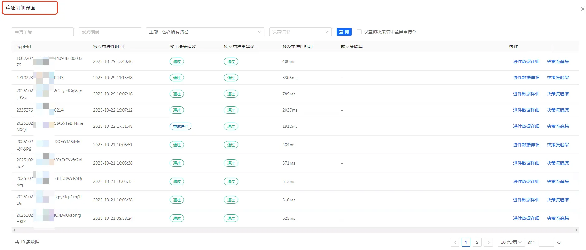 •决策引擎实时返回结果,平台监控通过率、响应耗时、规则命中路径等指标;•验证达标后,用户提交上线申请。