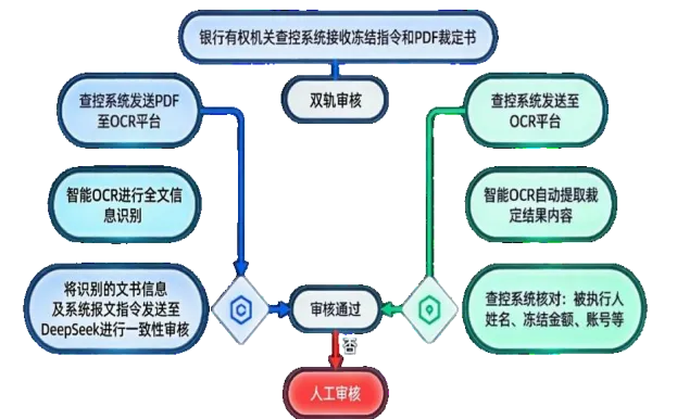 创新推出“智脑会审”AI审核引擎,采用“智能OCR + DeepSeek大模型”双轮驱动架构,实现司法文书从非结构化文本到结构化数据的高效转化与深度语义理解。智能OCR完成文书信息提取,大模型基于自然语言处理能力,对文书类型、执法主体、账号信息、冻结金额等关键要素进行一致性、完整性与合规性校验。该模式突破传统规则引擎对固定模板的依赖,可适应多样化格式与复杂表述,实现从接收到核验的全链条自动化。系统部署于本地私有云,确保数据安全可控。目前,文书识别准确率达99.3%,单笔审核效率提升90%。