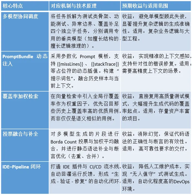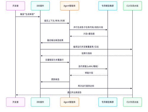 多模型生成的片段汇聚到融合引擎,通过投票机制(Borda Count)与断言去重优化,整合成一份完整的候选单元测试代码。 随后,代码进入本地运行验证环节。系统自动编译并运行测试,采集执行日志与覆盖率数据。如果发现编译错误或覆盖率未达标(例如<80%),系统会将具体的错误堆栈或未覆盖行号回灌给 Agent。Agent 据此利用 LoRA 插件或 Re-Prompt 机制进行针对性修复,直到满足质量标准或达到最大迭代次数。最终,通过验证的代码将自动推送到 CI/CD 流水线,完成集成。