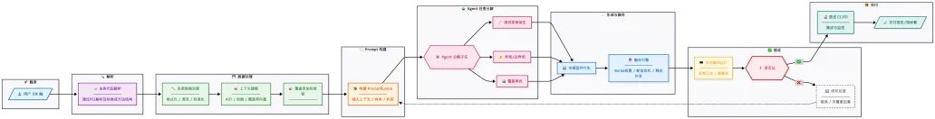 本方案的业务流程设计严密,涵盖了从源码解析到最终合入的全过程。整体流程可划分为 “初始化解析”、“智能生成与融合”、“闭环验证与反馈” 三个核心阶段。
