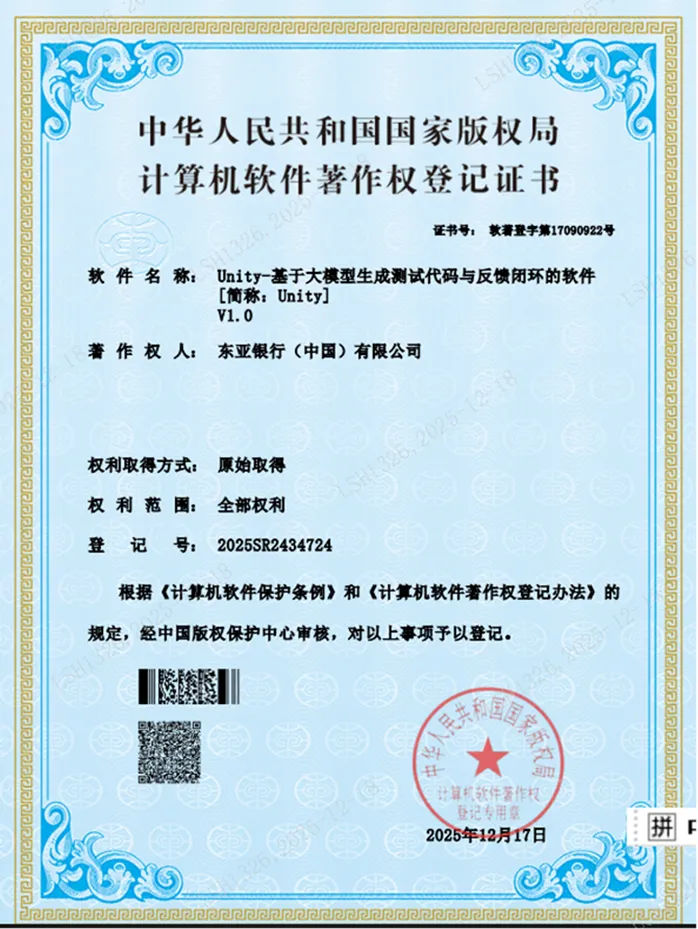 Unity由东亚银行(中国)有限公司完全独立自研、已获软件著作权与多项发明专利受理,其中软件著作权证书: