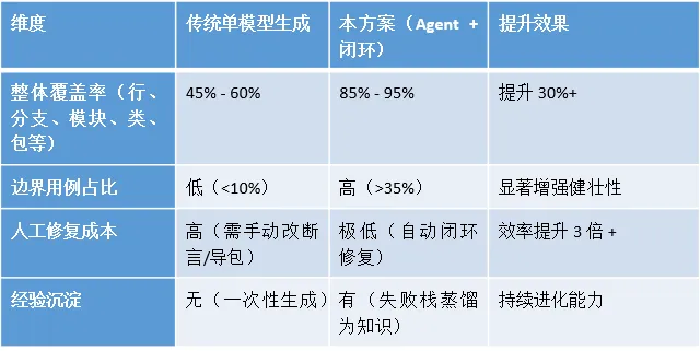覆盖率目标(Coverage Assurance): 核心目标是显著提升代码覆盖率。不仅要求全工程的平均行覆盖率达到行业领先水平(如>80%),更强调对分支覆盖、异常路径及边界条件的精准命中。通过覆盖率加权检索算法,确保生成的测试用例不留死角。