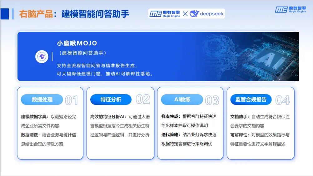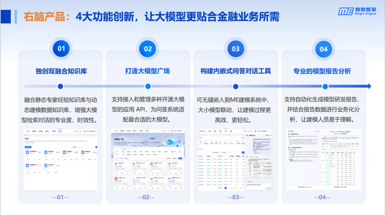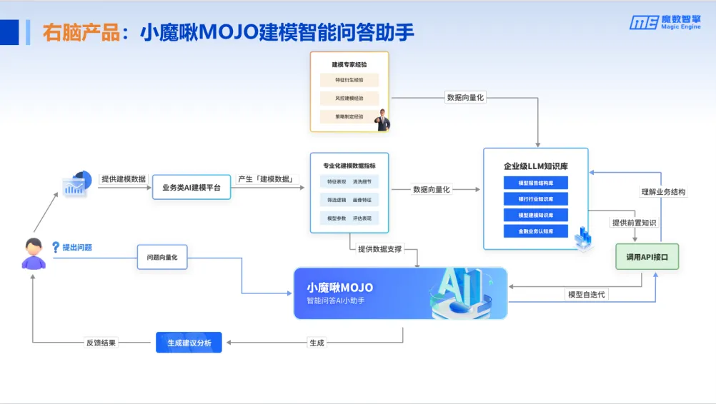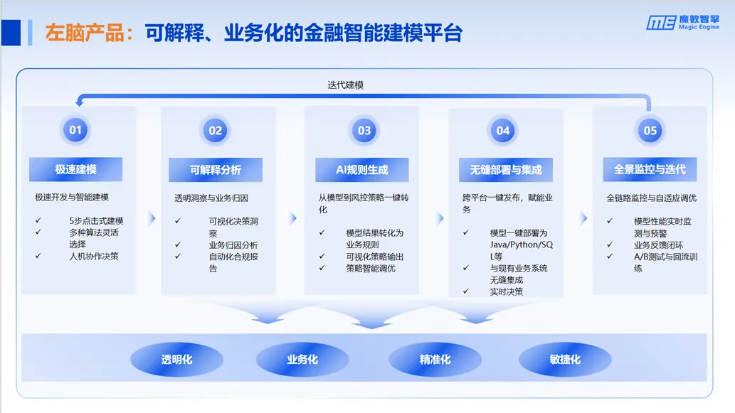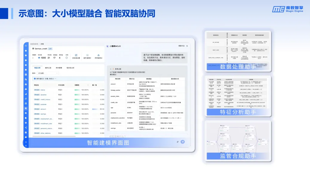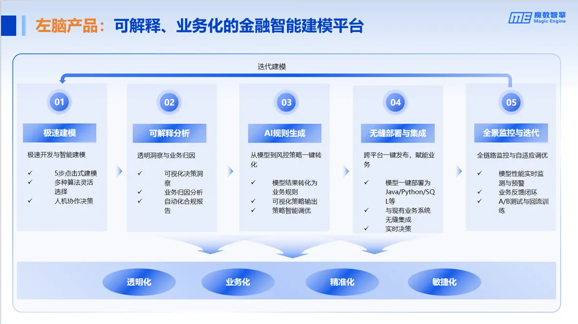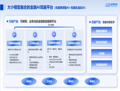 以左脑(预测型AI)保障结构化数据的精准决策。依托自研的可解释、业务化的金融智能建模平台(Magic Engine)构建全流程可追溯、全业务可适配的模型开发体系,为风控、营销等核心业务提供稳定可靠的决策支撑。(该产品已在全国60+知名金融机构规模化应用)