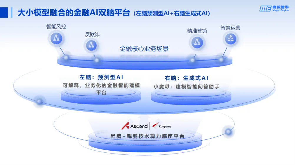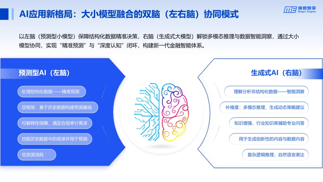 为破解这一行业共性难题,魔数智擎创新性地提出“金融AI双脑平台”架构,通过有机融合大小模型优势,构建新一代金融AI系统。