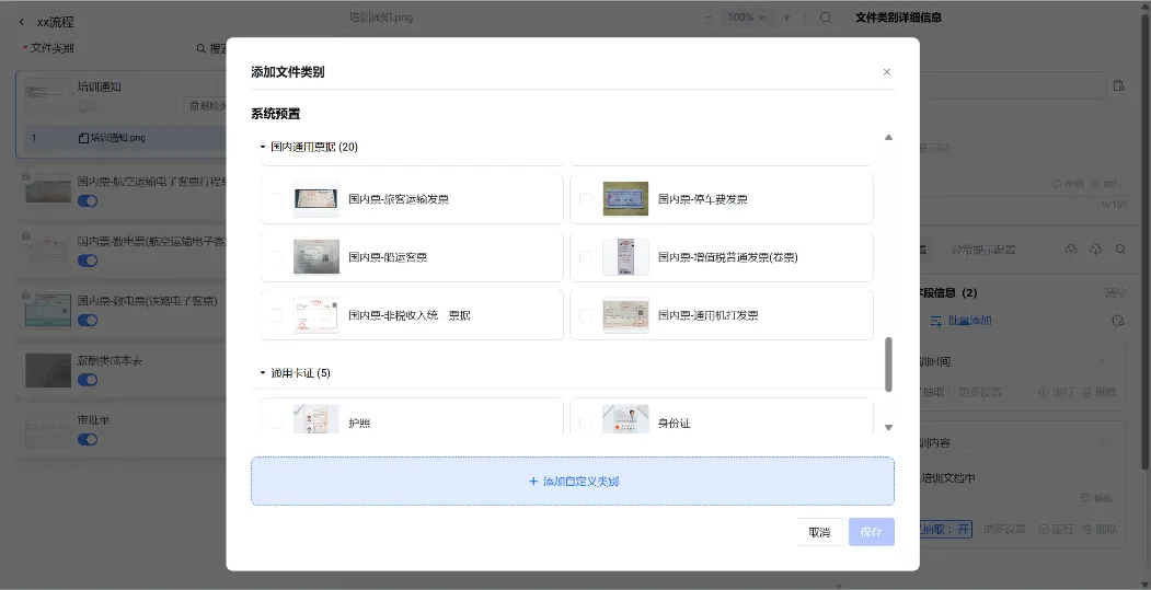 系统内置多种小模型及预设字段,开箱即用,如通用卡证、国内通用票据等;对于业务场景要求的多种文档类型,小模型可与大模型同时灵活搭配,共同处理业务,兼顾效率与准确率。