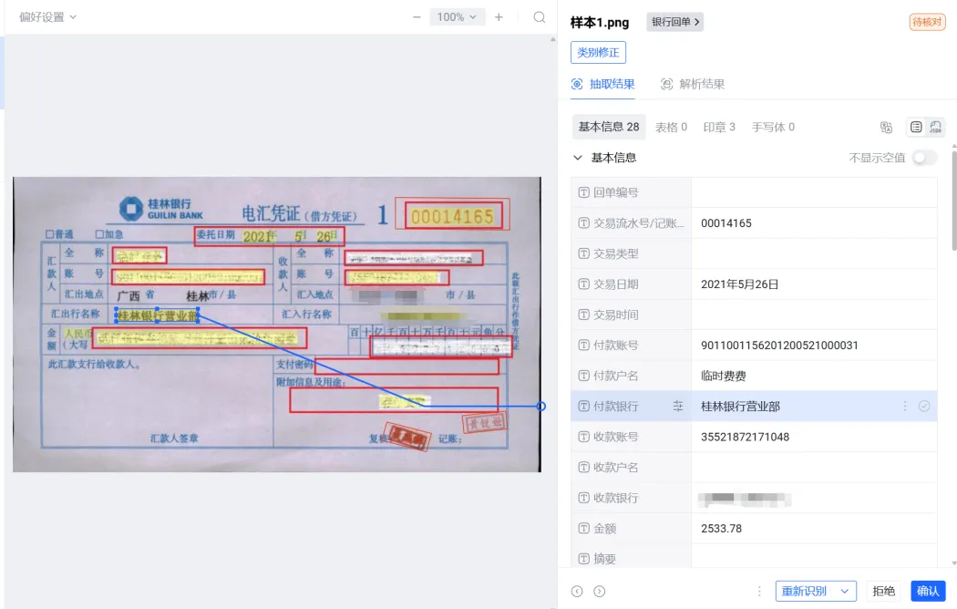 以电汇凭证处理为例:通过智能分类并自动识别票据类型和要素信息,能够替代一录完成提取和录入,无需人工干预;对于手写文字由OCR自动识别手写文字,识别不准的数据由人工补录修正。