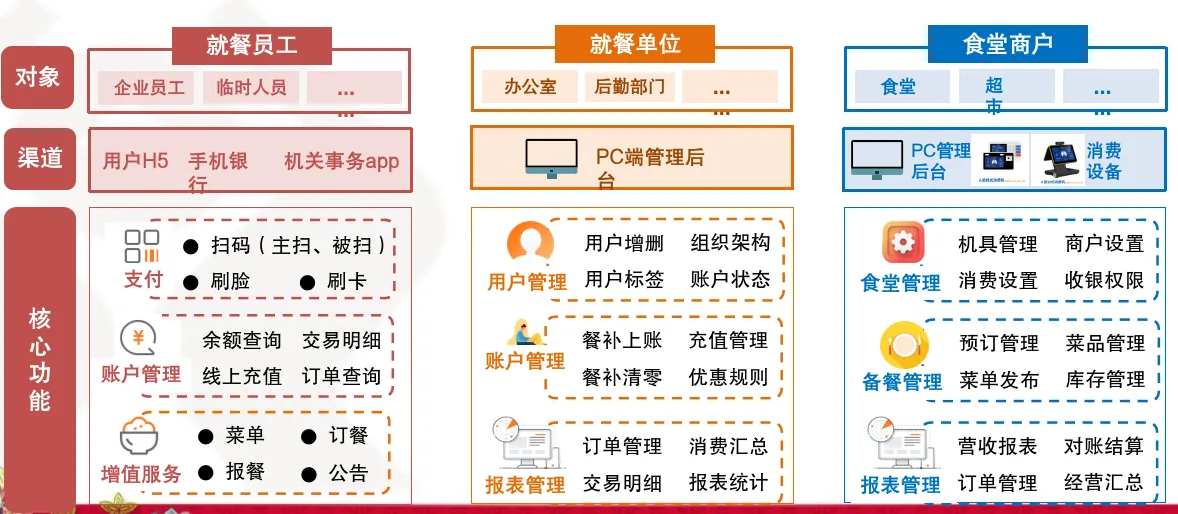 3. 价值实现目标:助力合作单位食堂实现数字化升级,降低运营成本与潜在风险;强化银行在民生场景的服务粘性,沉淀对公资金,拓展餐补代发等关联金融业务;通过支付便捷化、资金安全化、管理精细化,提升就餐用户(学生、员工、病患等)体验,实现食堂运营方、就餐用户、银行多方共赢,形成可复制的 “金融 + 多场景食堂” 赋能模式。
