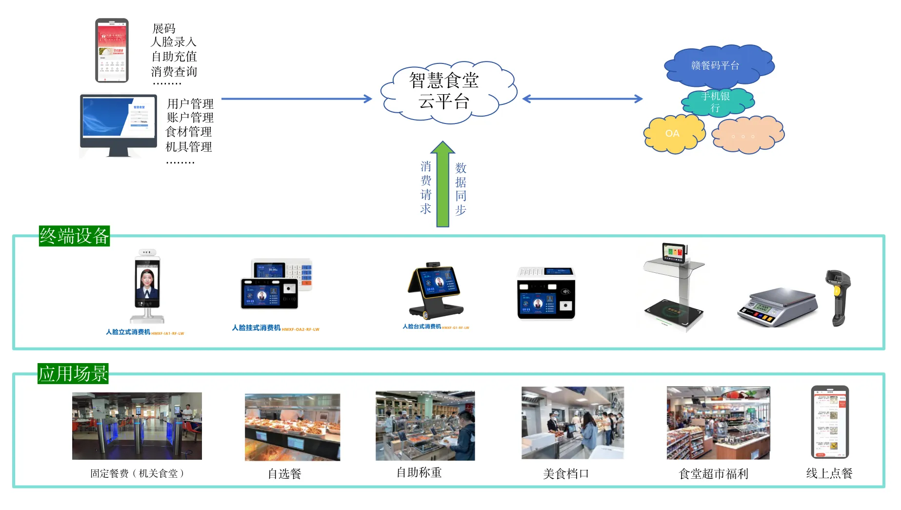 2. 技术落地目标:打造云端集中管控的智慧食堂系统底座,实现 1 秒人脸比对扣款、终端离线交易自动同步;精准对接赣餐码平台接口,保障跨单位数据互通;同步实现充值资金流向可查、账户资金监管、食材进销存数据实时更新,满足基础管理需求。