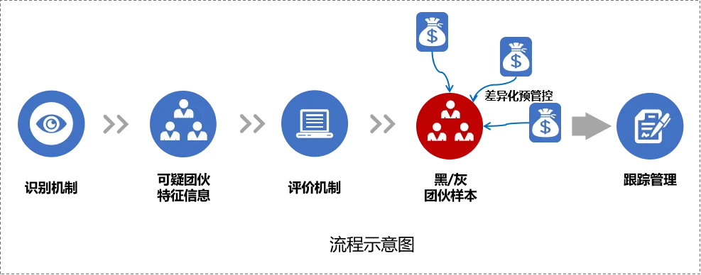 通过规则引擎和智能算法,对可疑团伙特征信息进行深度挖掘与评价,输出相对稳定的团伙特征(黑/灰样本);
