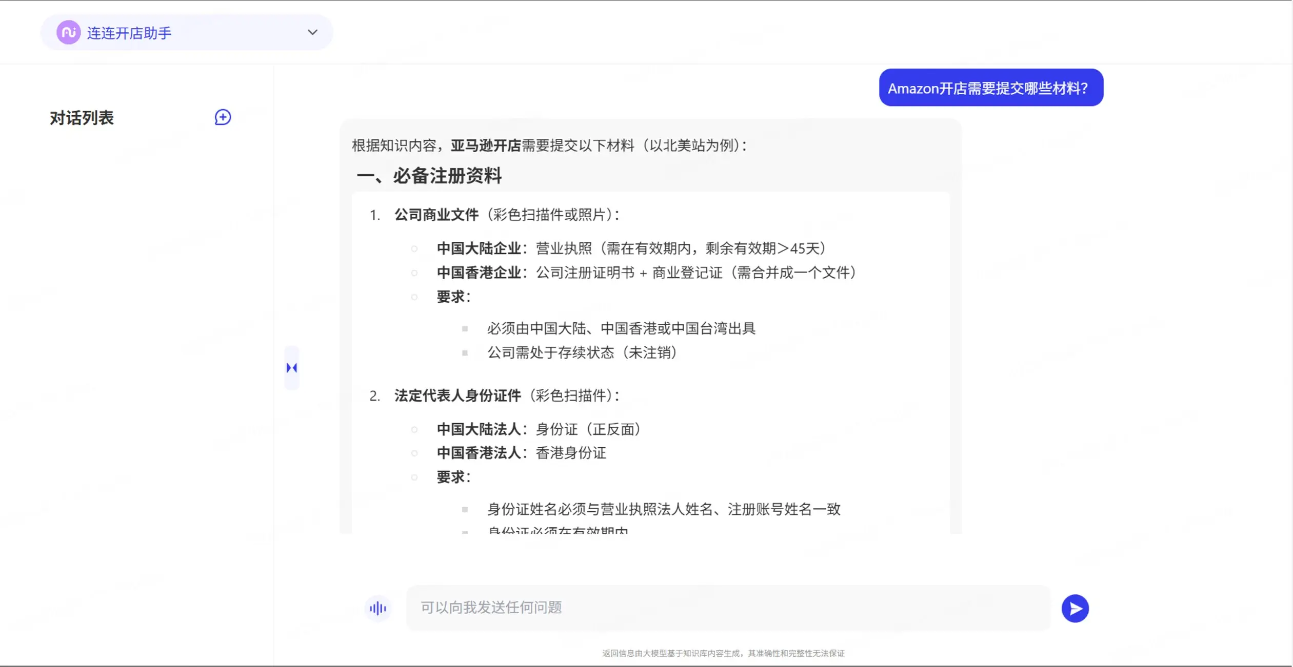 秒级应答:用户输入关键词(如“亚马逊店铺绑定”),AI秒级匹配知识库,输出结构化解答;