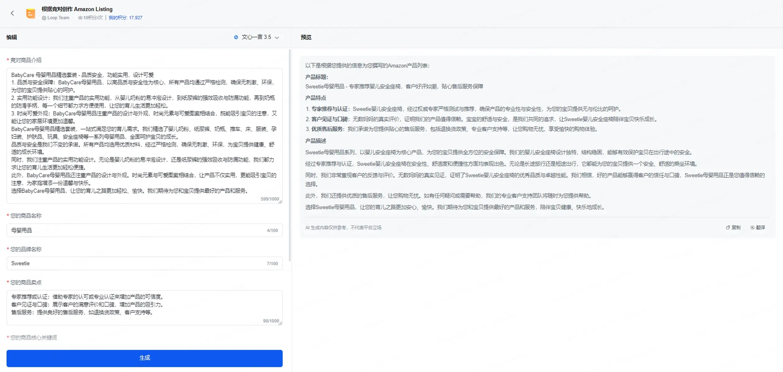 文本AI:覆盖Listing、Post文案、FAQ、SEO文章等全场景创作,结合用户搜索习惯优化关键词,提升商品曝光率。