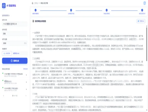 4、AI审批提示:报告生成同时,系统依托专家经验数据库与外部数据,自动提示关键风险指标,并提供不同角度下的AI审批建议,实现经验数字化赋能。