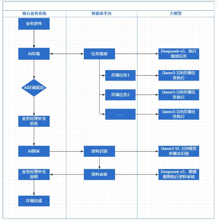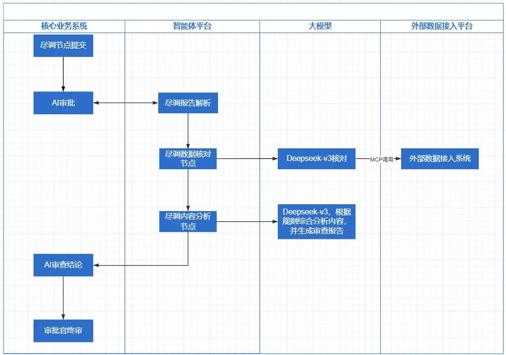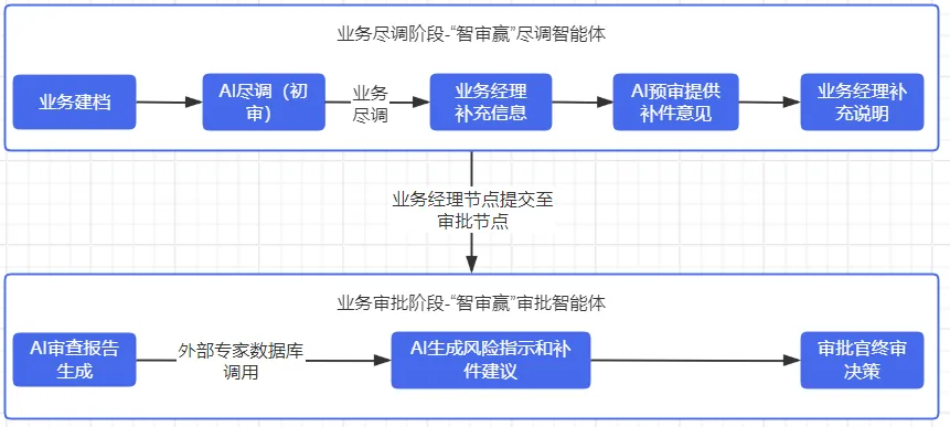 “智审赢”-尽调审批智能体项目,由尽调智能体和审批智能体组合而成,充分融入当前业务中,具体流程如下: