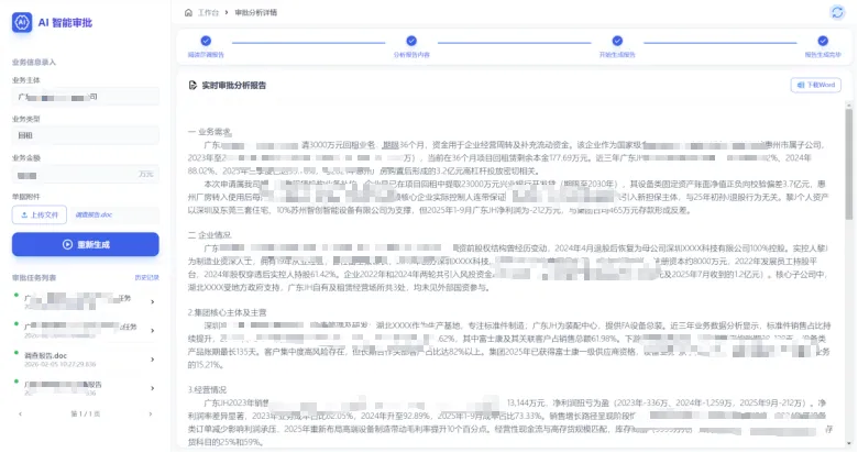 3、审查报告自动生成:审批端收到任务后,系统可一键自动生成审查报告详细草稿,完整呈现客户画像、经营分析、风险要点及业务方案,审批官仅需聚焦于核心判断,案头工作和业务沟通时间减少约50%。