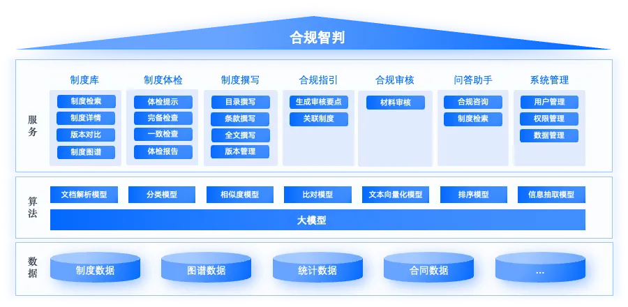 利用人工智能、大数据等新兴技术,实现监管规则“信息化”向“工具化”转型,服务于金融机构法律合规的工作场景。搭建涵盖行内外监管制度的合规知识库,利用合规数据资产和NLP能力,赋能制度审核、外规内化、合规检查等业务流程,实现合规系统智能化;根据监管制度和行内合规审查场景,生成材料审核要点/业务操作指引,并对合同等文档材料进行合规性审核,给出审核意见。