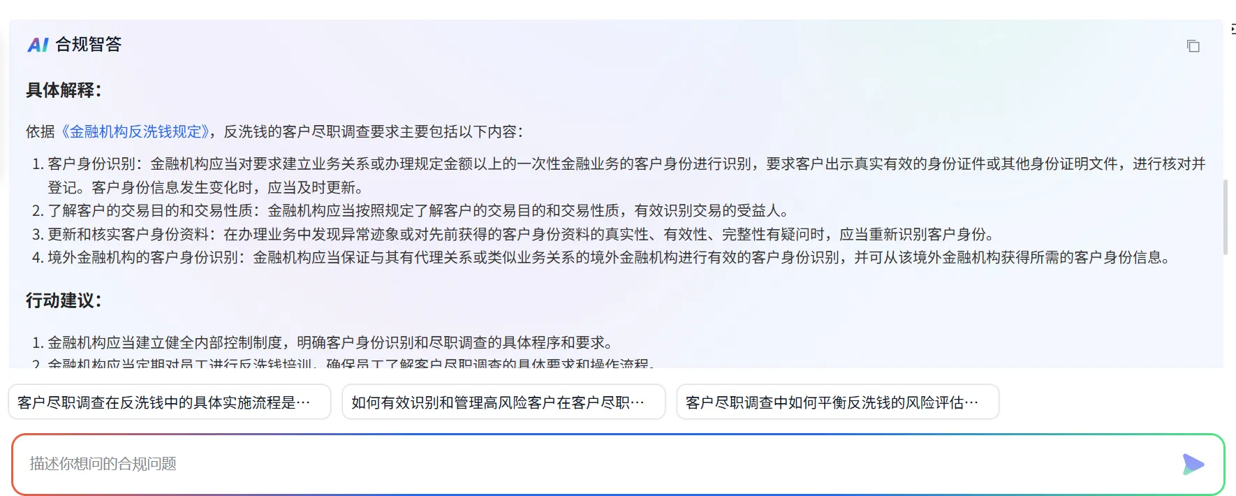 针对行内当下合规痛点,整合行内规章制度并及时同步外部多部门监管政策,辅助完成行内制度修订;贴合银行数据安全与合规要求,打造全层级安全防护体系,助力银行构建数字化、智能化的合规管理体系,推动合规管理从“被动应对”向“主动防控”、从“人工驱动”向“数据驱动”转型。通过合规数据沉淀与智能分析,为银行合规决策、制度优化、业务创新提供数据支撑,同时推动合规文化落地,优化银行人才结构,带动员工数字素养提升,适配银行长期数字化转型需求,增强银行核心竞争力。