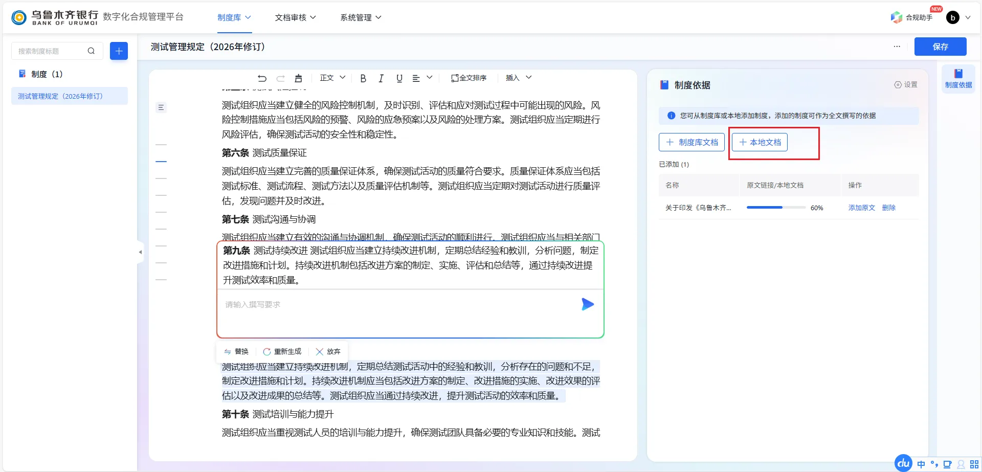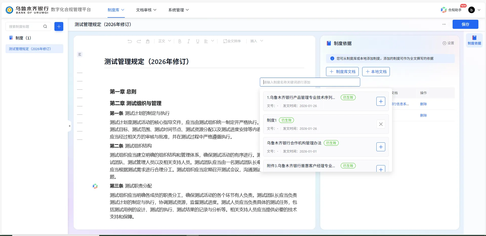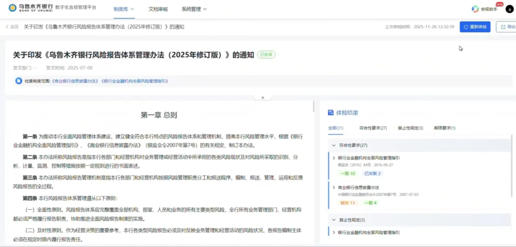 乌鲁木齐银行智慧合规平台,依托人工智能与大模型技术,利用大模型+RAG/Agent在合规垂直领域的深度融合,将合规治理模式从“被动遵循” 转向 “主动赋能”,形成 “实时、持续、自动化” 的合规管理体系,为数字化转型与可持续增长提供坚实保障。平台不仅实现了对监管发文、内部制度、合同文本的结构化解析,更通过智能体,将合规审查节点嵌入业务流程,实现了从“事后人工抽检”向“事前智能预判、事中实时控制”的转型,有效降低了合规操作风险与人力成本。