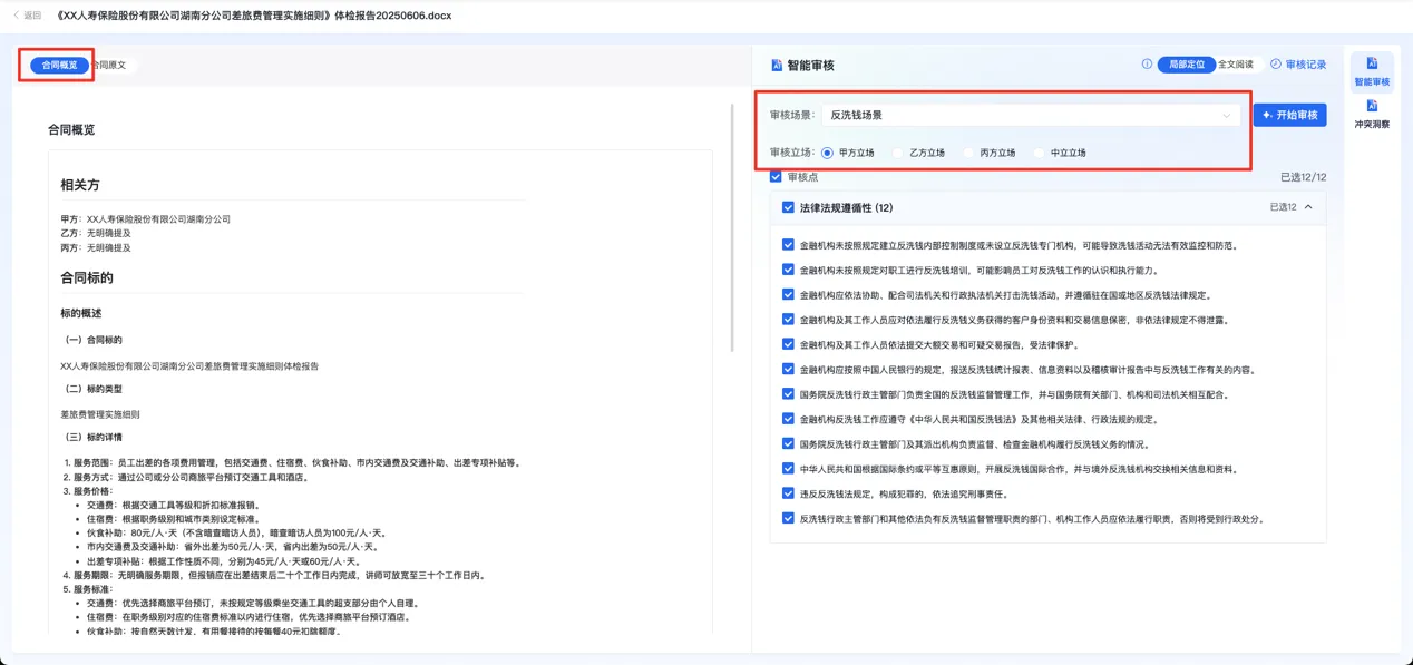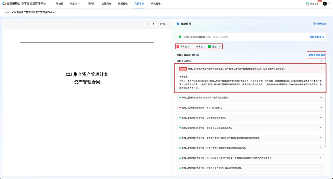 以AI智能引擎为核心支撑,融合自然语言处理、模型算法、知识图谱等技术,打破传统人工驱动的管控模式。通过大模型实现监管法规智能解读、合同和制度条款自动审查、异常行为精准识别,例如自动拆解监管新规条款并打标分类,生成“监管-制度-控制”三层映射图谱,无需人工逐字梳理;合同合规审查可快速解析条款、标注风险点并生成评审报告,相对于传统的人工审查方式,效率得到有效提升,同时降低人工解读偏差风险,让合规管控从“经验依赖”转向“技术精准”,推动合规管理迈入“AI智控”新阶段。