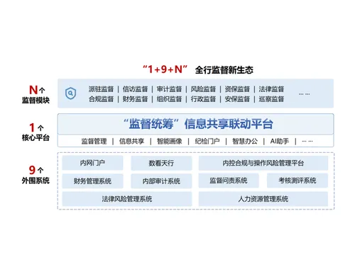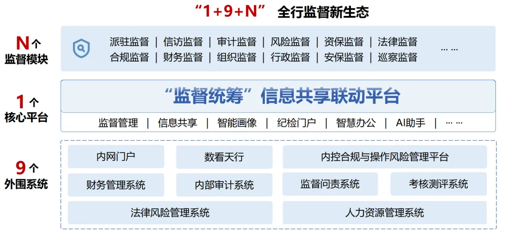天津银行“监督统筹” 信息共享联动平台的建设,紧密结合天津银行监督业务流程与数字化转型战略,以 “数据为基、技术为翼、流程为脉” 构建系统架构,核心涵盖数据层、技术层、应用层三大模块,实现监督数据全量汇聚、监督过程智能赋能、监督协作线上闭环。实现构建大监督工作格局机制,运用监督管理机制、监督信息共享机制、数据监督等机制,进行全方位、全过程监督,充分发挥各监督主体作用。