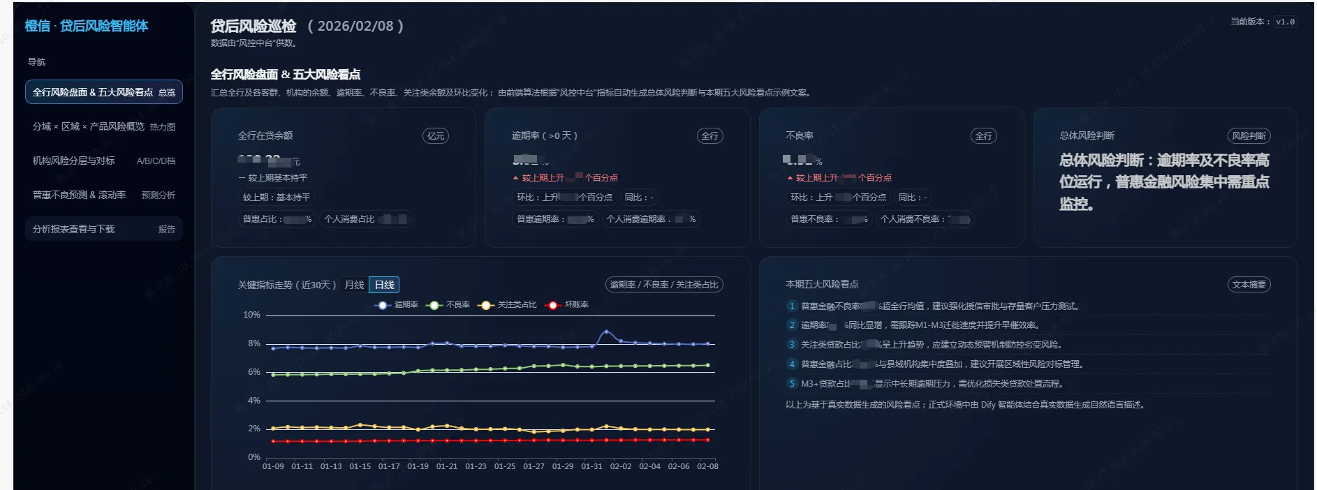 4.利用国产大模型和多智能体技术,将复杂的指标解读、诊断研判和管理建议生成流程自动化,支撑贷后风险日报、月报和专题报告的一键生成;