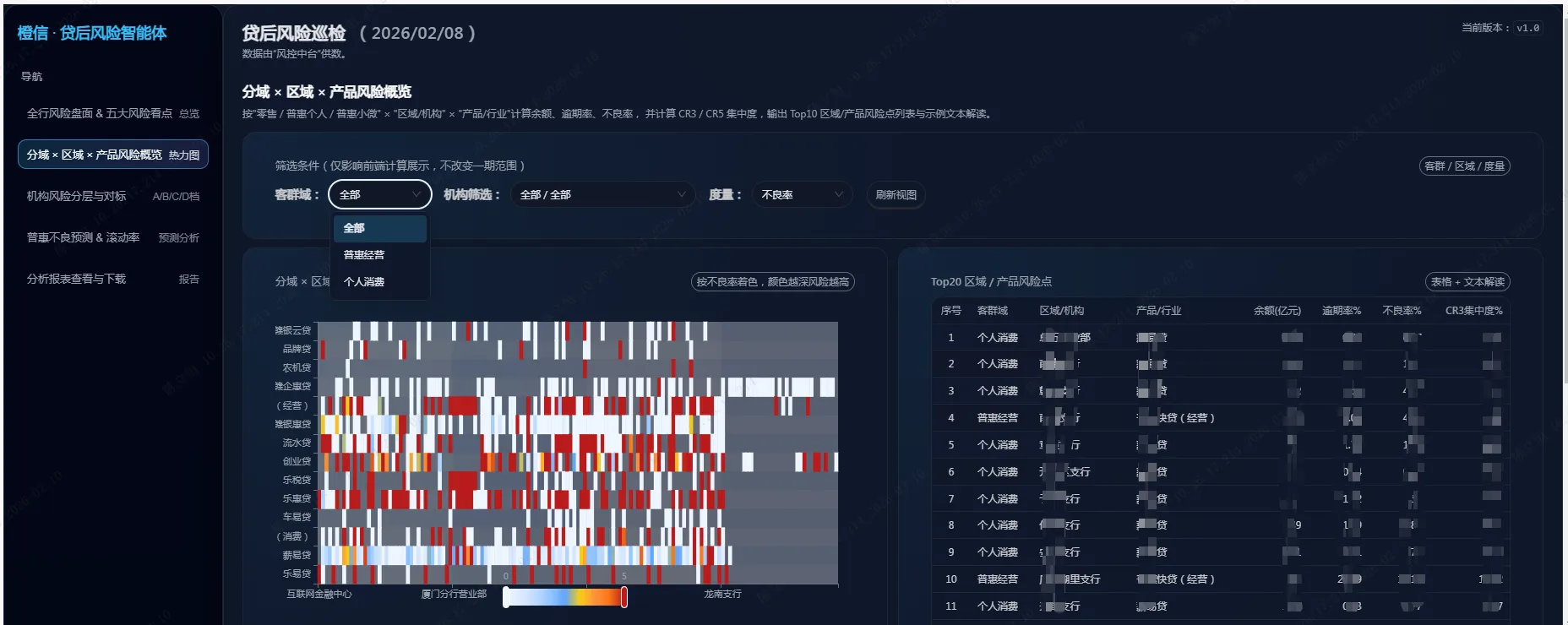 二是分域×区域×产品风险概览热力图。围绕“区域差异化管控”要求,构建“分域—区域—产品”三维风险视图。通过预聚合各区域、各机构、各产品的余额、逾期率、不良率、CR3集中度等指标,并引入分位数分段、动态阈值等方法,形成风险热力图展示,直观呈现高风险区域与高暴露产品的交叉重叠。智能体在此基础上自动识别风险热点和异常值,用专业语言形成“风险集中区域”“指标明显偏离同类均值”等结构化结论,为区域授信政策调整和差异化贷后策略提供依据。