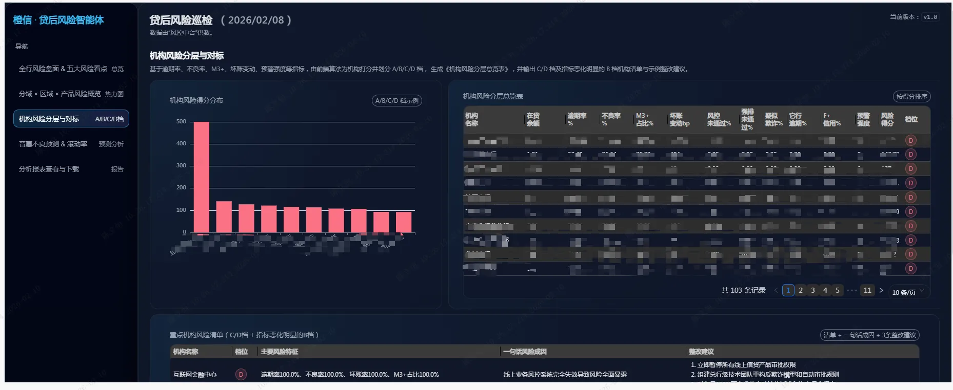 三是机构风险分层与A/B/C/D档对标。面向条线管理“怎么管机构”的现实需求,构建多指标机构风险评分与分层体系。系统以逾期率、不良率、M3+占比、CR3集中度、业务扩张速度、模型拦截效果等为核心指标,采用标准化处理和权重加总形成机构风险评分,并据此划分A/B/C/D档。评分结果与Top榜单联动展示,智能体基于结构化指标自动生成“机构风险画像”“风险集中领域分析”“原因研判”等段落,从产品结构、客户结构、区域特征、业务节奏等维度给出专业判断,为授信限额管理、考核问责、差异化管控提供可直接引用的决策依据。