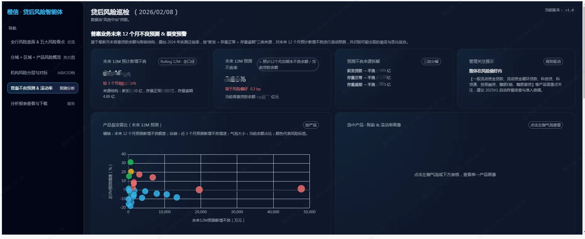 四是普惠不良预测与滚动率分析模块。在沿用现有静态池分析框架基础上,建设普惠贷款未来12个月新增不良预测模块。通过维护产品层面的M0→M1、M1→M2…M7+迁徙率参数,将贷款拆分为“新发贷款、存量正常、存量逾期”三类来源,测算各类资产在未来12个月内转不良的预计金额,并计算“近3个月预测增速”等指标,刻画风险抬升速度与裂变风险。系统结合不良率、M3+占比、集中度等指标,为产品自动打上“裂变风险、温和抬头、结构可控”等标签,大模型在此基础上生成“预测新增不良来源结构分析”“风险扩散路径说明”等专业文字,实现对潜在高危组合的前瞻识别和可解释展示。