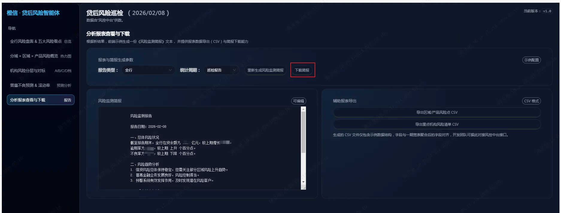 五是分析报表智能生成与下载。在原有人工作业基础上,重构《风险分析报告》《普惠专项风险分析专报》等报表的生产流程,建设“智能体自动生成+人工审核确认”的新模式。项目通过统一的风险JSON数据集,将各模块输出的指标、排名、名单、标签和建议进行标准化汇集,再结合预置的报告章节模板与术语规范,由大模型一键生成包含“全行风险总览、风险热点榜单、重点机构深度分析、风险工具与预警表现、管理行动清单与责任分解”等内容的完整报告,支持Word导出和历史版本留痕。该模块显著减少了人工整理和撰写工作量,同时保证了报告口径统一、逻辑完整与专业表达,有力支撑管理层高频、快速、规范地开展风险例会和决策复盘。