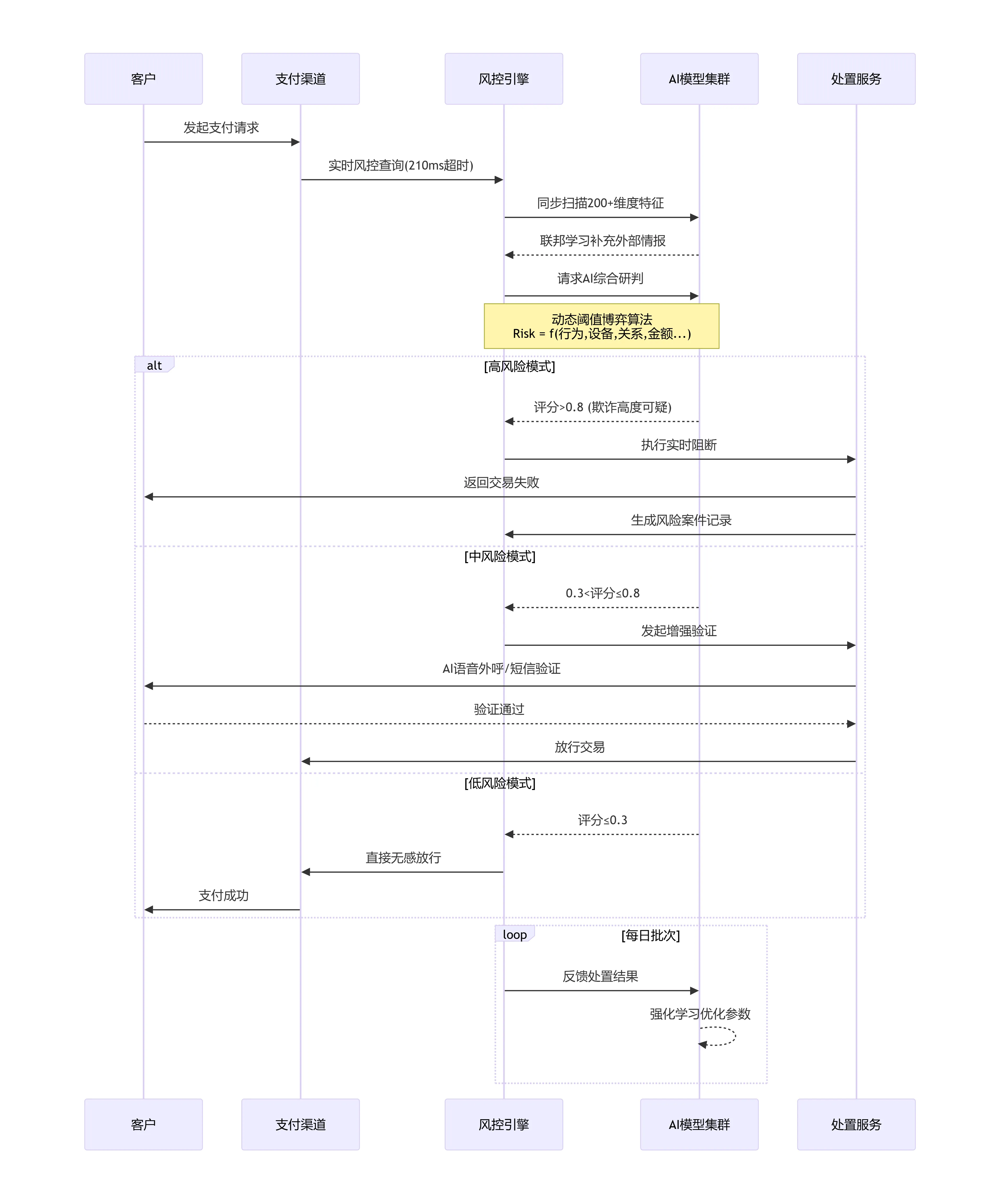 第二层:毫秒级实时决策。 这是方案的技术中枢。系统能在银联、网联通道规定的极短时间窗内(通常低于210毫秒),对每笔交易进行超过200个维度的实时特征扫描,并调用万级策略与模型进行高速运算。最终,根据动态风险评估结果,自动执行“实时阻断”、“发起二次验证”或“无感放行”的分级处置指令,实现风控干预的精准化与瞬时化。