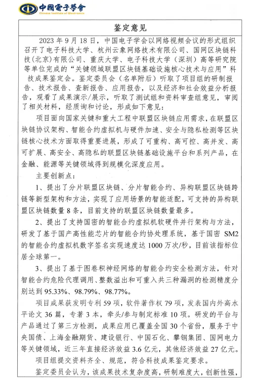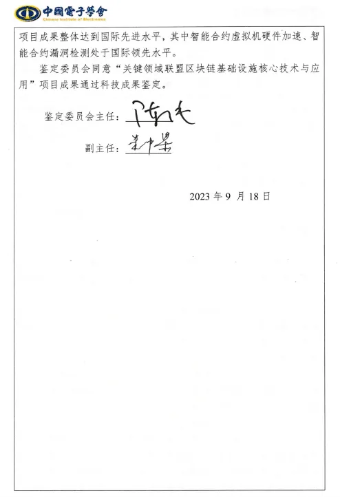 本案例的相关项目“关键领域联盟区块链基础设施核心技术与应用”成果物获得中国电子学会科技进步二等奖:2023年9月18日,中国电子学会组织召开了成果鉴定会,中国工程院院士陈纯(区块链与数据安全全国重点实验室主任)为鉴定委员会主任、中国科学院院士朱中梁为副主任。鉴定委员会认为,该成果技术复杂度高,研制难度大,创新性强,项目成果整体达到国际先进水平,其中智能合约虚拟机硬件加速、智能合约漏洞检测处于国际领先水平。鉴定委员会同意“关键领域联盟区块链基础设施核心技术与应用”项目成果通过科技成果鉴定,最终获得中国电子学会科技进步二等奖。