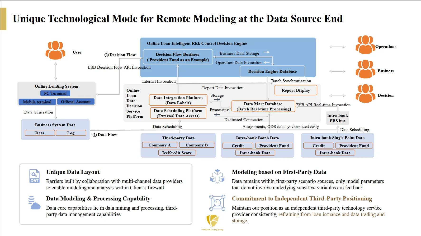 (1)数据主权合规架构:行业唯一的"数据不出域"联邦建模模式 区别于Experian、FICO等海外厂商要求数据回传至中央服务器的模式,冰鉴独创联邦学习框架:数据科学家远程访问客户防火墙内的脱敏数据,模型训练全程在客户本地完成,仅梯度参数加密传输。该模式通过ISO 27001认证,满足GDPR、PDPA最严格条款。