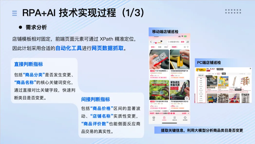 依托店铺页面模板固定、页面的元素可通过XPath定位的特性,用RPA框架批量抓取客户入网场景提供的网页或者APP载体的数据和图片信息,替代人工重复劳动,破解巡检效率低、人力成本高的痛点。且基于业务情况,搭建“直接+间接”双层巡检内容的指标体系,结合大模型对场景的图片以及商品描述等字段对比与多维度数据交叉验证,解决人工判定主观、误差大、风险遗漏的问题。
