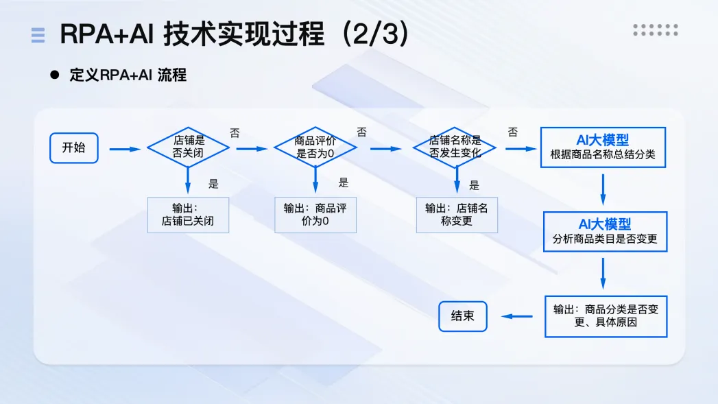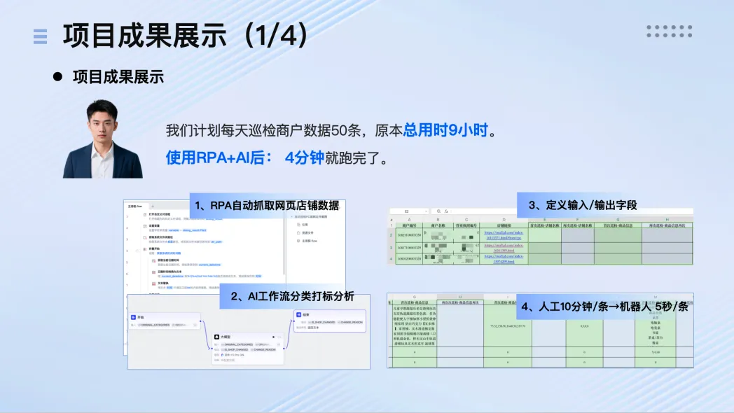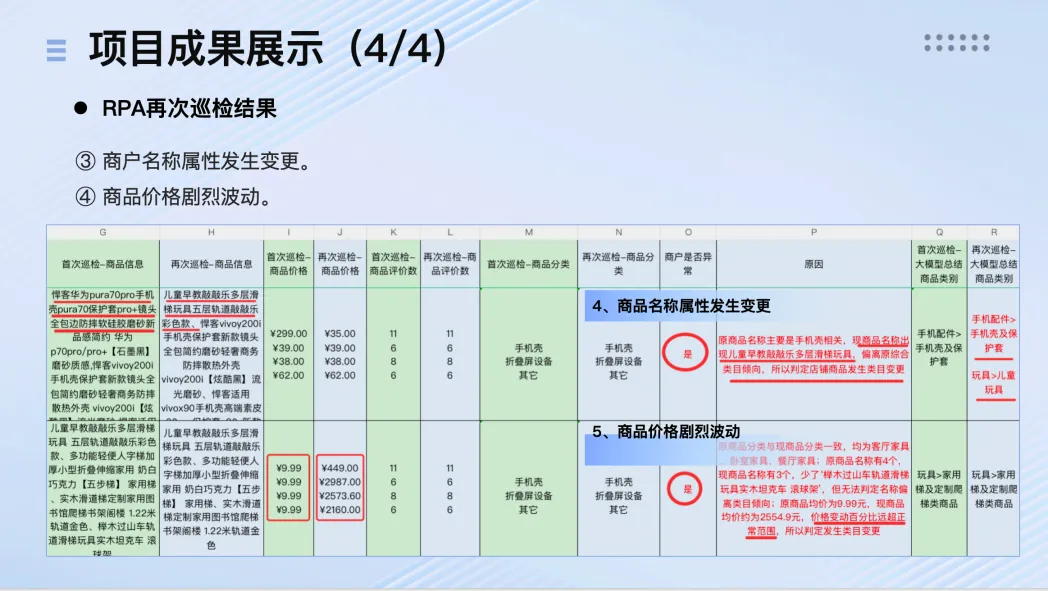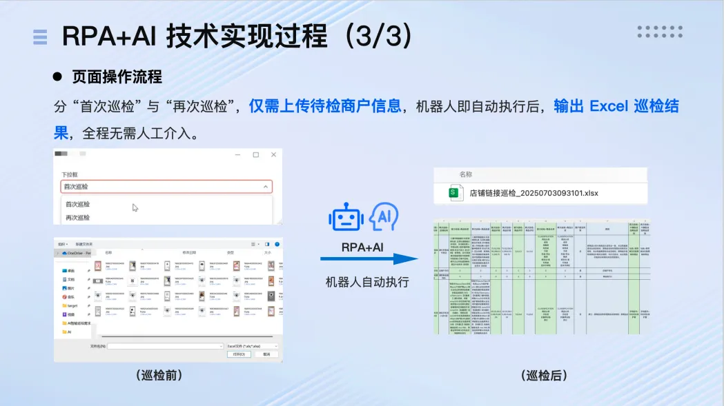 1、巡检效率飞跃提升:本方案以RPA+大模型技术协同为核心,适配社交电商固定模板店铺的XPath精准定位特性,搭建“直接+间接”双层指标体系,实现巡检全流程自动化、标准化,兼顾显性类目变更识别与隐性交易真实性核查,把单店巡检需要人工花费10分钟压缩到单店自动化巡检仅需1分钟。
