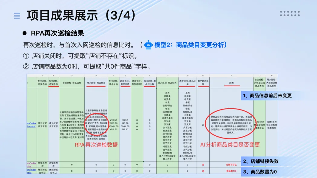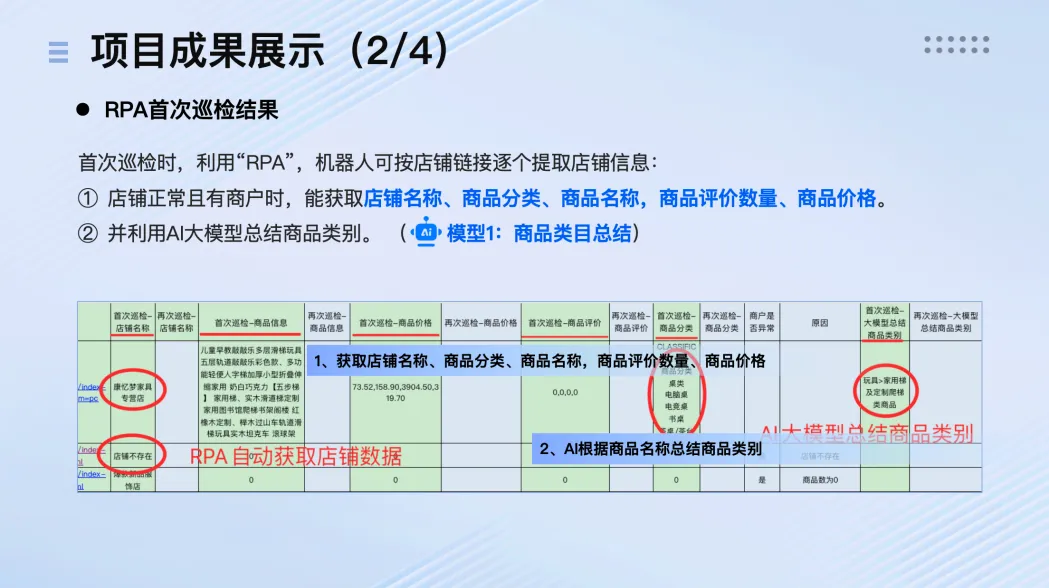 有效数据采集:针对正常经营的店铺,自动化提取4项核心信息,包括店铺名称、商品信息、商品价格、商品评价、商品分类;并依托AI大模型,自动完成商品类别的智能总结与归类。