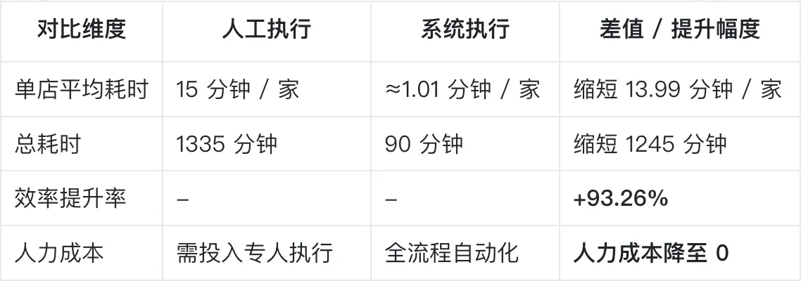 结论:每周完成89家店铺的巡检任务,人工执行需耗费1335分钟,RPA系统仅需90分钟,总耗时缩短1245分钟,效率提升超93%;且系统全流程无需人工介入,直接实现人力成本归零。