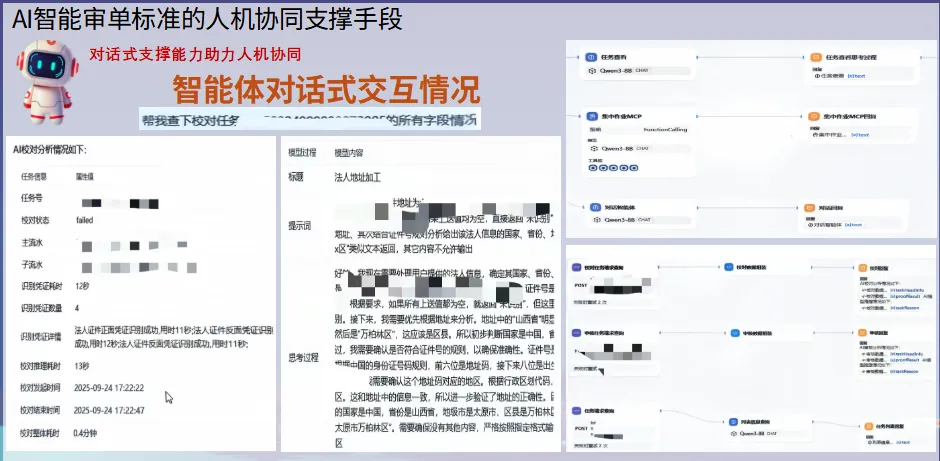 系统与人工审核专家形成了高效的协同机制。AI负责常规标准化审核,在识别到存疑时,实时触发人工介入并推送结构化审核建议。此模式既发挥了AI的效率优势,又保留了人类专家的经验价值,实现了“效率”与“精准”的平衡,定义了下一代金融业务流程的人机协同标准。